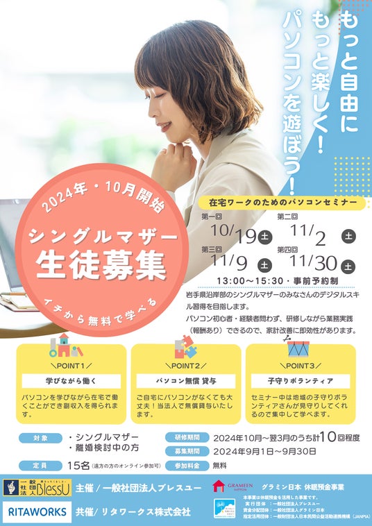 https://www.iwate-np.co.jp/pr/prtimes/44659一般社団法人BlessU子育てと仕事を両立しながら、新しいスキルを身につけたいと感じたことはありませんか?そんなシングルマザーのあなたにぴったりの無料デジタルスキル研修が、この秋スタートします!